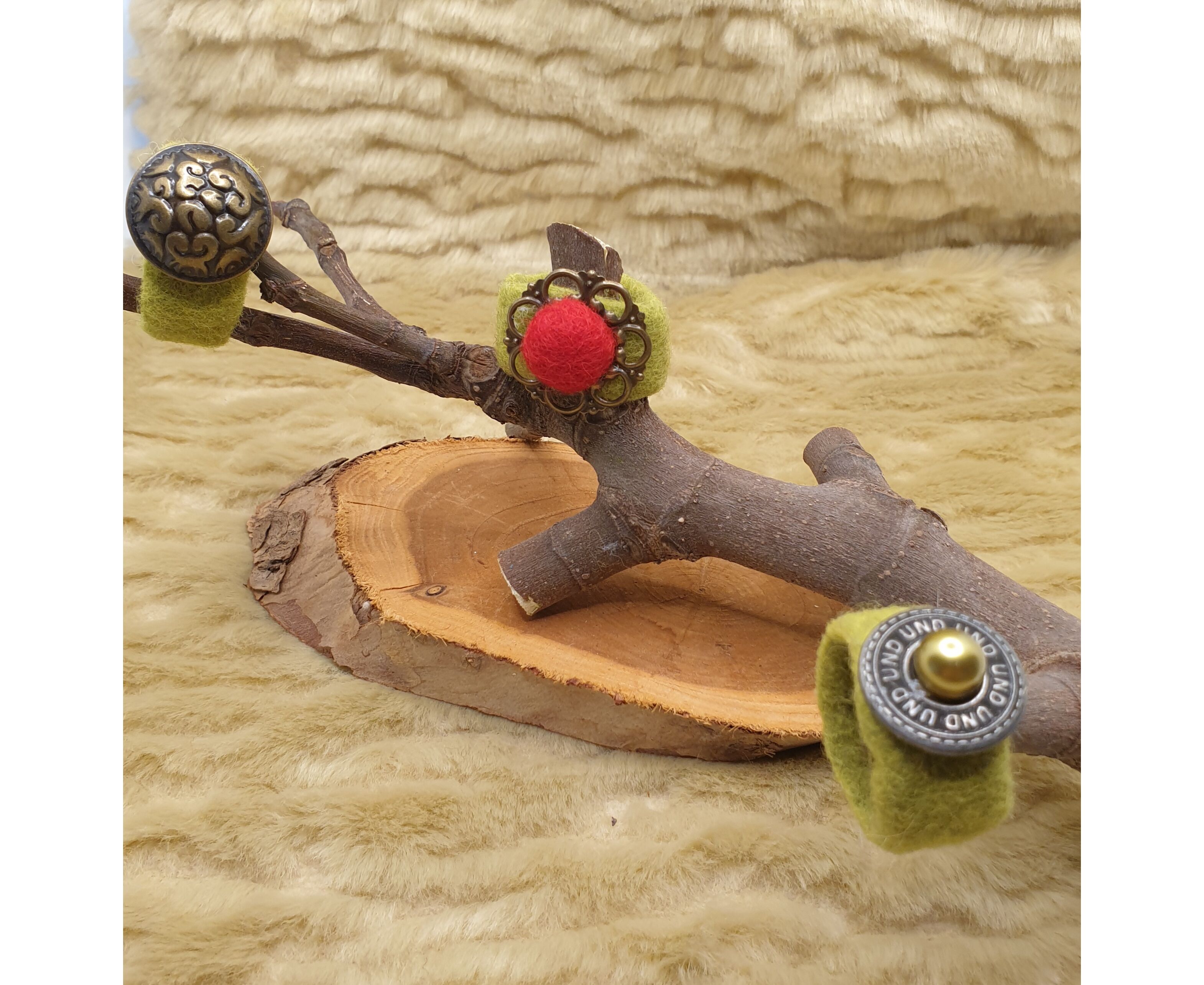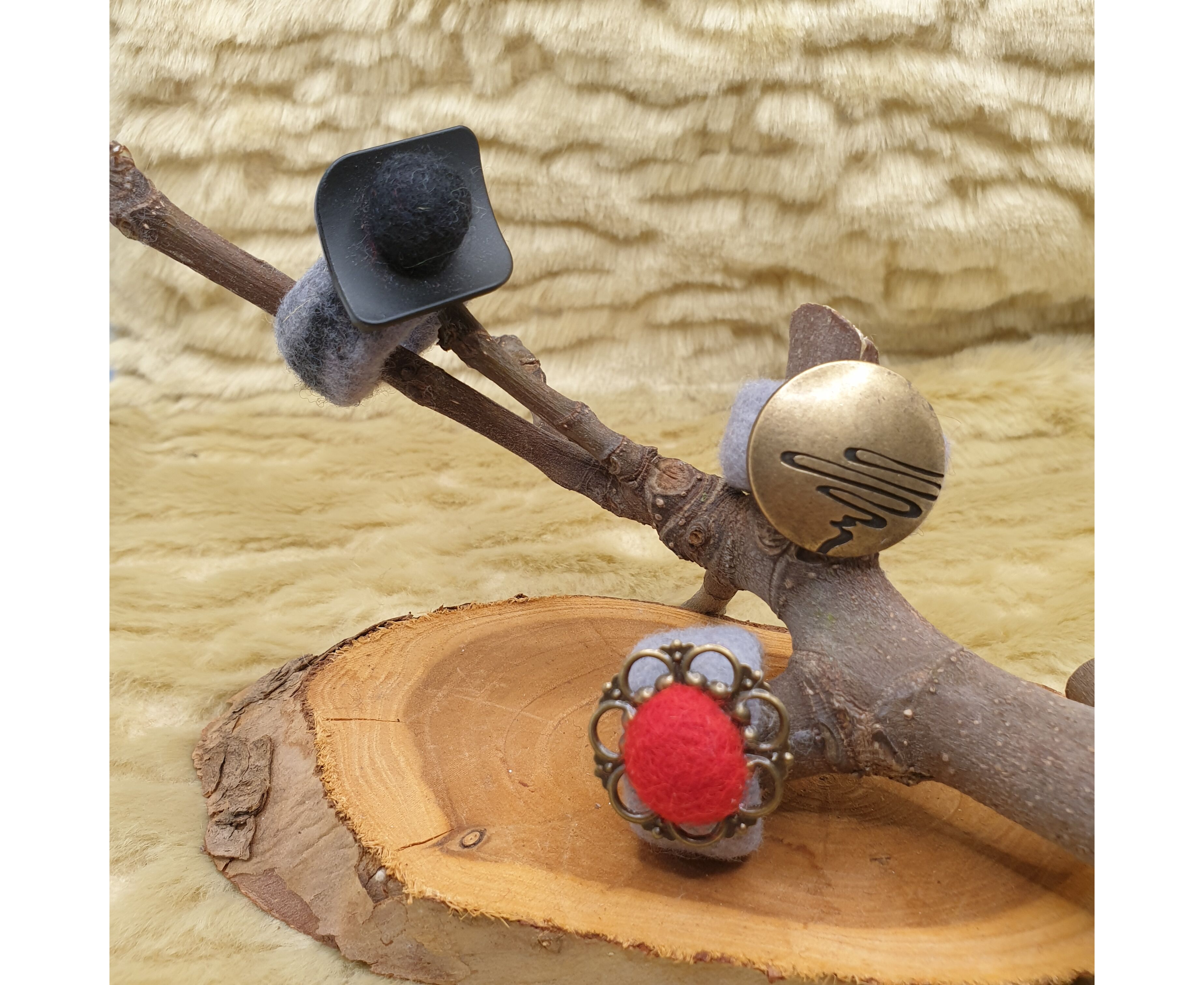 Handgefertigte nassgefilzte Fingerringe aus 100% Merinowolle mit Perlen ,Metall oder Kunststoff Details.