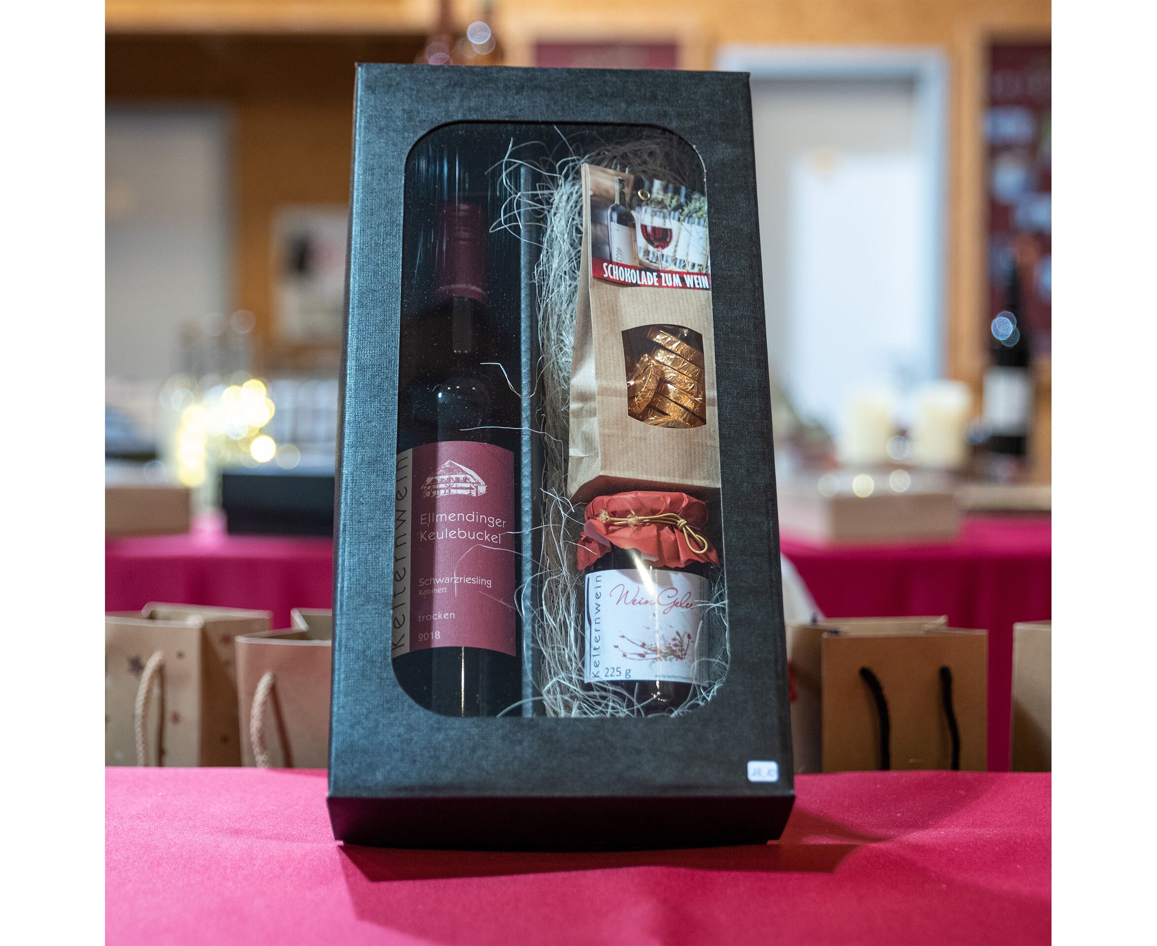 Präsentschatulle mit 1 Flasche Rotwein, einer Packung Käsegebäck und einem Glas Weingelée weihnachtlich dekoriert. Abbildung ähnlich.