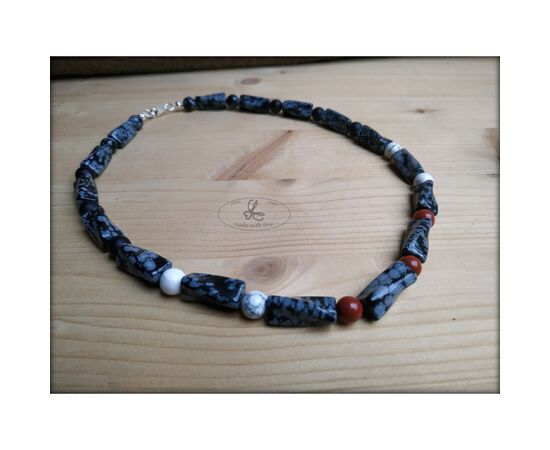 Mit Schneeflockenobsidian , Jaspis rot, Onyx und Magnesit. Verschluss: Karabiner Silber 925Länge 50cm, Gesamtbreite ca. 9mm