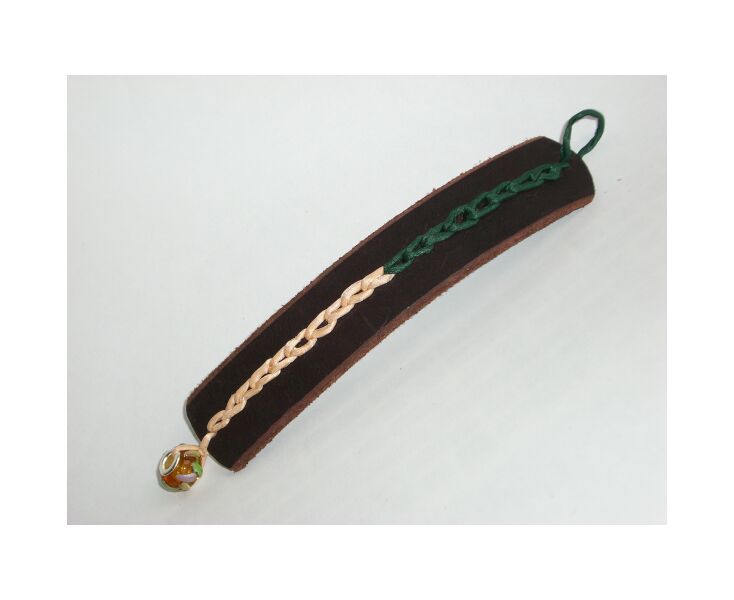 Hochwertiges Unikat; 3x15,4cm; Pflanzlich gegerbtes, 3mm Rindsleder dunkelbraun; Stickerei: Kettstich mit Seidenschnur in zartrosa + tannengrün; Rückseite Nappaleder; Glasperle als Verschluß; Logo-Knopf; Stofftasche