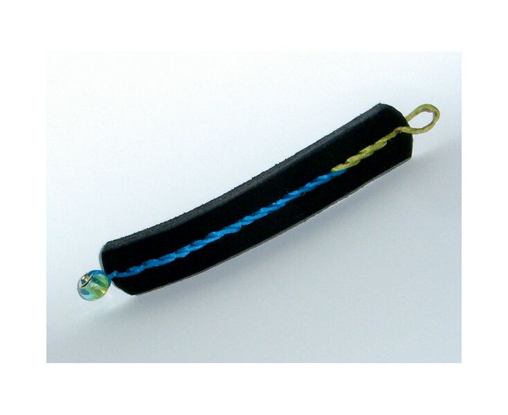 Hochwertiges Unikat; 3x15,5cm; Pflanzlich gegerbtes, 3mm Rindsleder schwarz; Stickerei: Stielstich mit Seidenschnur in kornblumenblau + lindgrün; Rückseite Nappaleder; Glasperle als Verschluß; Logo-Knopf; Stofftasche