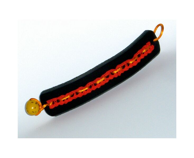 Hochwertiges Unikat; 3,5x16,0cm; Pflanzlich gegerbtes, 3mm Rindsleder schwarz; Applikation rotes Spitzenband; Stickerei: Stielstich mit Satinband in orange; Rückseite Nappaleder; Steinnußperle als Verschluß; Logo-Knopf; Stofftasche