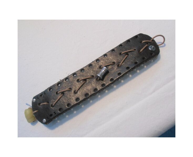 Hochwertiges Unikat; 3,5x17,0cm; 3mm Rindsleder dunkelbraun mit Nieten + gelocht; Stickerei: Parallel-V Durchzug mit Baumwollschnur gewachst; Rückseite Nappaleder; Glasperle als Verschluß; Logo-Knopf; Stofftasche