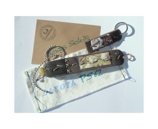 Hochwertiges Unikat; 4x18,8cm; Pflanzlich gegerbtes, 3mm Rindsleder dunkelbraun + schwarz; Applikation: Lederfell-Label; Stickerei: Parallel-Schräg Durchzug mit Baumwollschnur gewachst; Rückseite Nappaleder; Perle aus Achat als Verschluß; Logo-Knopf; Stofftasche - Dazu passend der Schlüsselanhänger Texas Sch20. Beide Teile zusammen nur 130,- €