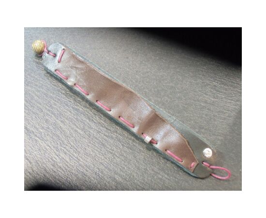 Hochwertiges Unikat; 3,5x18,7cm; Pflanzlich gegerbtes, 3mm Rindsleder schwarz; Applikation: Nappaleder braun; Stickerei: Vorstich mit Baumwollschnur gewachst; Rückseite Nappaleder; Holzperle als Verschluß; Logo-Knopf; Stofftasche