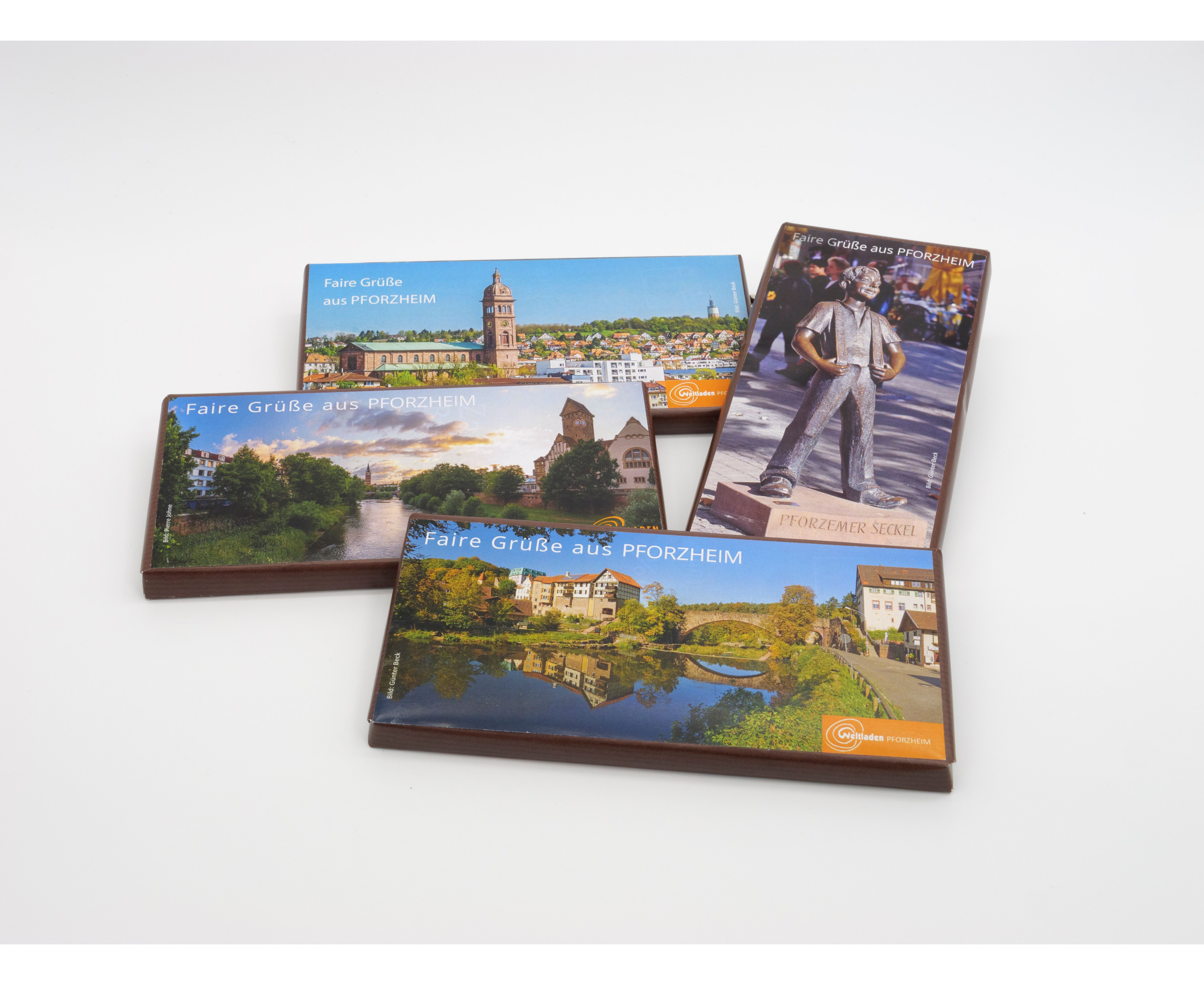 Verschenke faire Grüße aus Pforzheim. Die fair gehandelte Schokolade erlaubt Schokifans das Schlemmen ohne schlechtem Gewissen! Du hast die Qual der Wahl, denn die leckere Vollmilch-Schokolade ist erhältlich mit verschiedenen Stadtansichten.