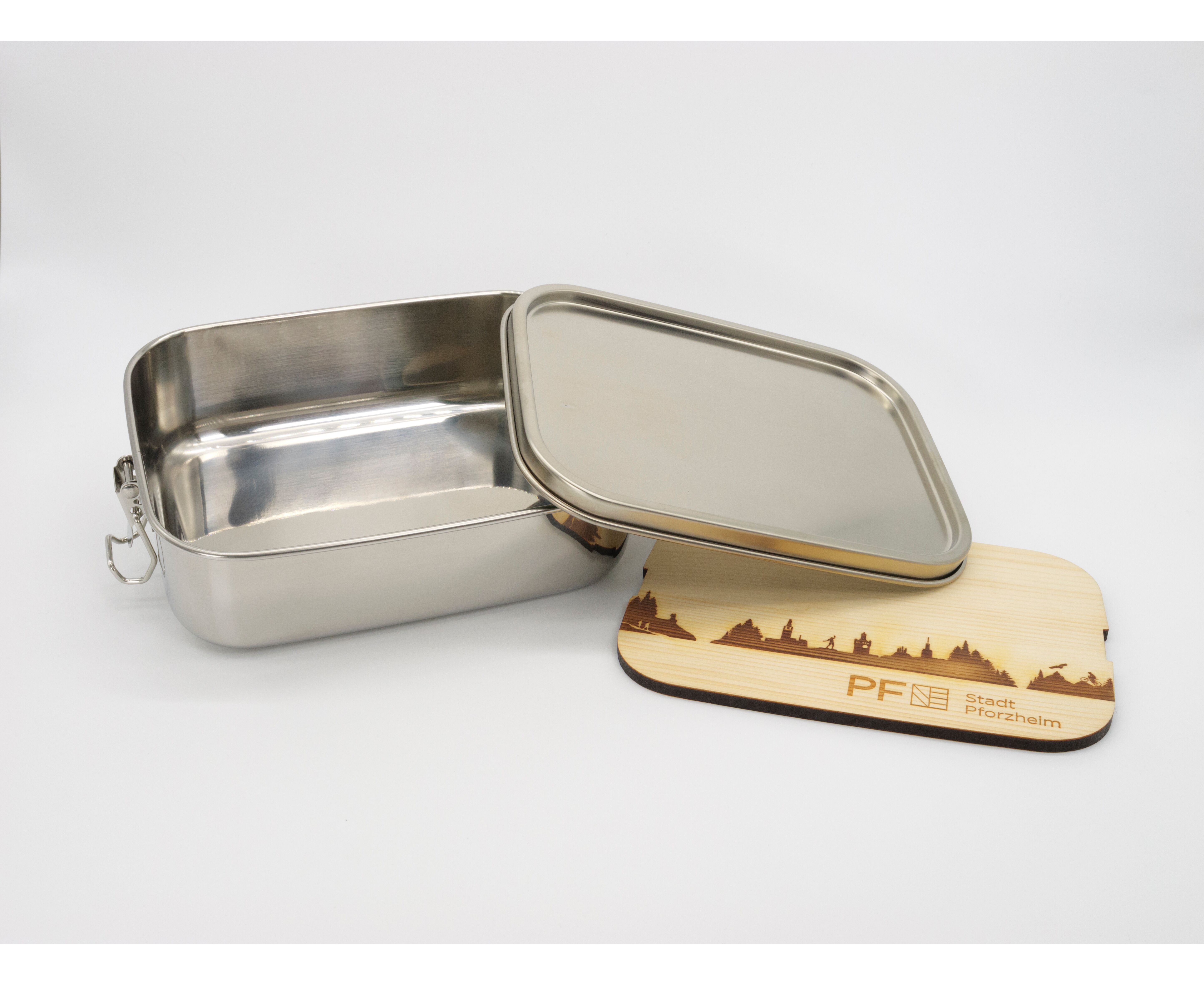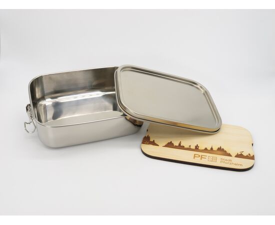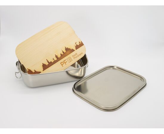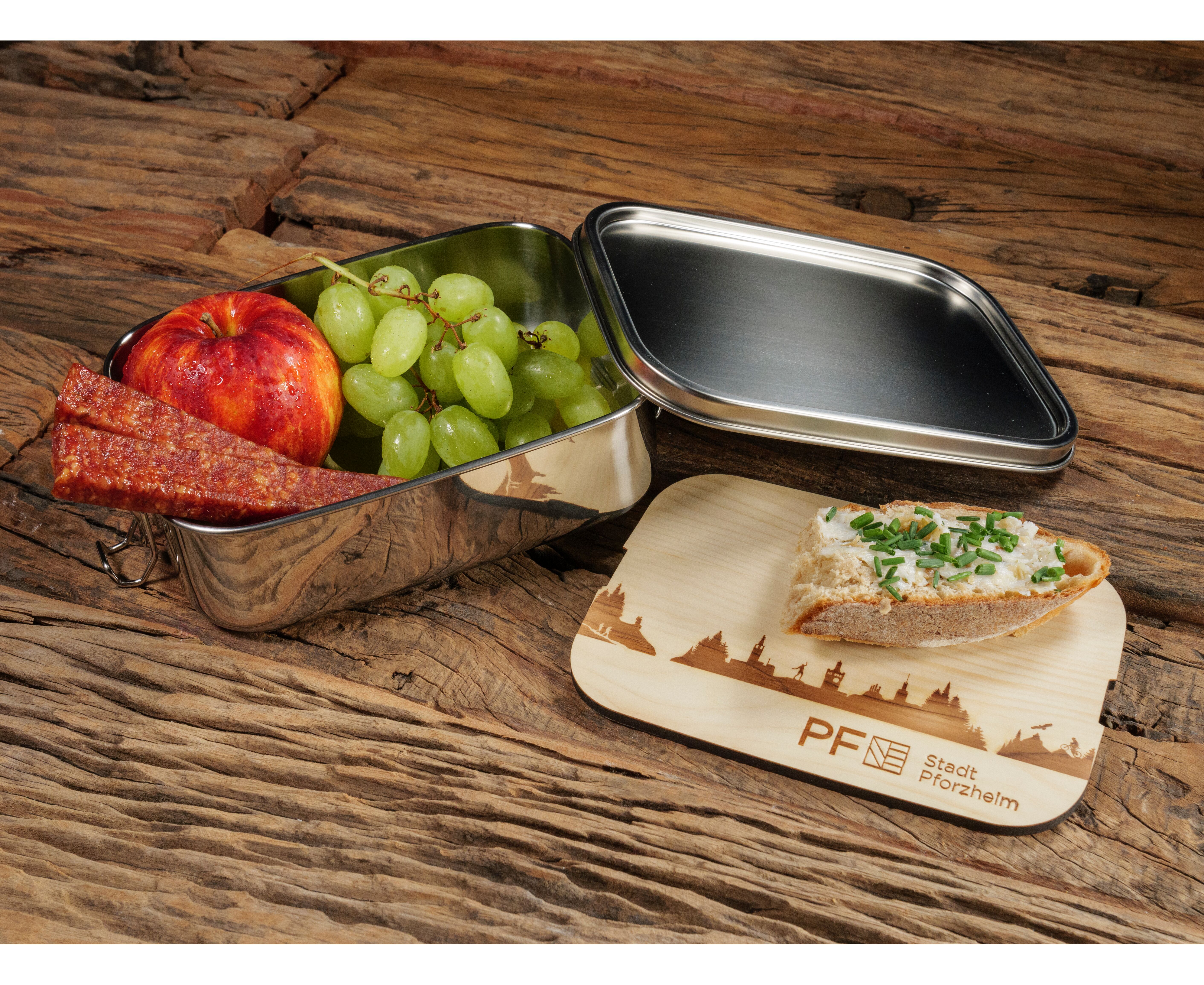 Dein nächstes Vesper im Büro oder unterwegs kannst Du in unserer hübschen Brotzeitdose mitnehmen. Das dazugehörende Schneidbrett mit der Skyline Pforzheims als Branddruck ist aus naturbelassenem Zirbenholz und die ideale Ergänzung für eine zünftige Brotzeit.
