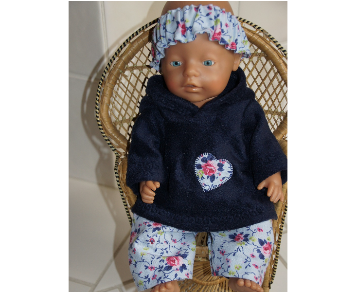 bestehend aus einem kuscheligen, dunkelblauen Kapuzenpulli mit Herzchenappli, einer Hose und einem Stirnband.