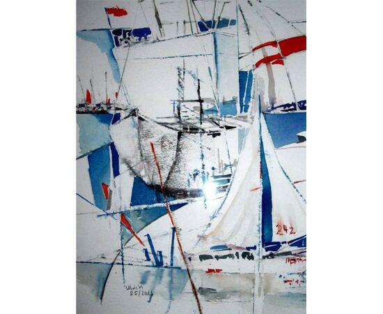 Boot und Hafen - Original Aquarell mit Passpartout 40*50 cm