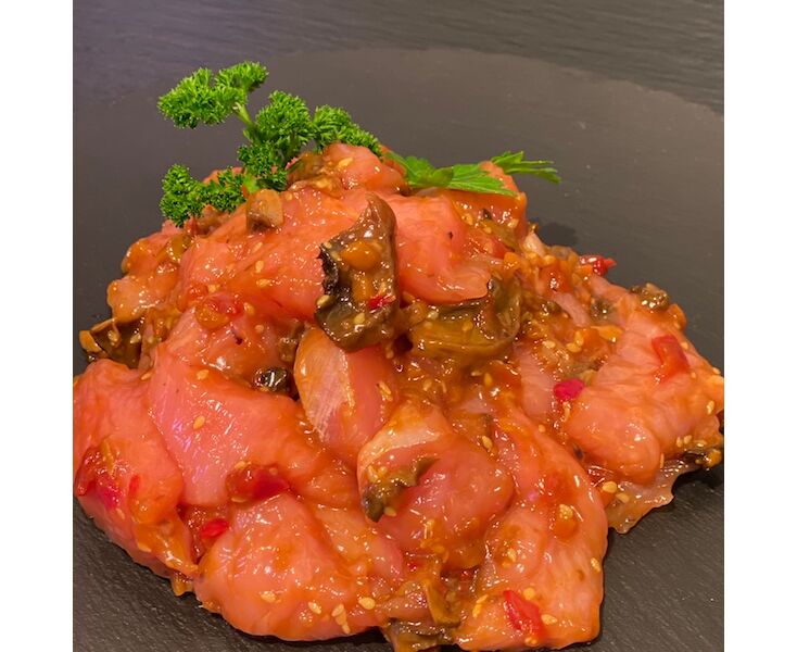 Zartes Putengeschnetzeltes in einer feinen Roasted Sesam Sauce , mit einer leichten süßlichen Note abgerundet. Mit etwas Öl in der Pfanne anbraten, Garzeit ca. 5 Minuten. Frech und lecker genießen.