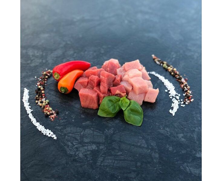 ca. 500g /Portion aus zartem Schweine- und Rindfleisch inn feine Würfel geschnitten