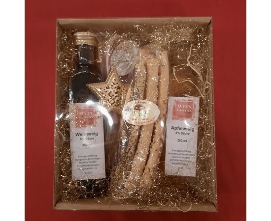 Essig aus heimischen Produkten. Je 1 Flasche Rotweinessig vom Keulebuckel und Apfelessig von heimischen Streuobstwiesen. 1 Packung Salzgebäck und 1 Scheibe Schwarzwälder Schinken. Ausschließlich örtliche Produzenten.