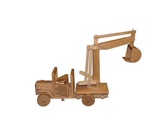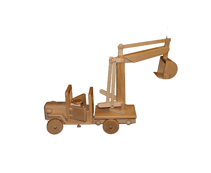 Stabiler, selbst hergestellter Holz-LKW aus Buchenholz; der Bagger is voll funktionsfähig und kann mit den drei Steuerhebeln wie ein großer Bagger gesteuert werden.Die Aufsätze können gewechselt werden, so dass Sie jeden LKW mit unterschiedlichen Aufsätzen versehen können.