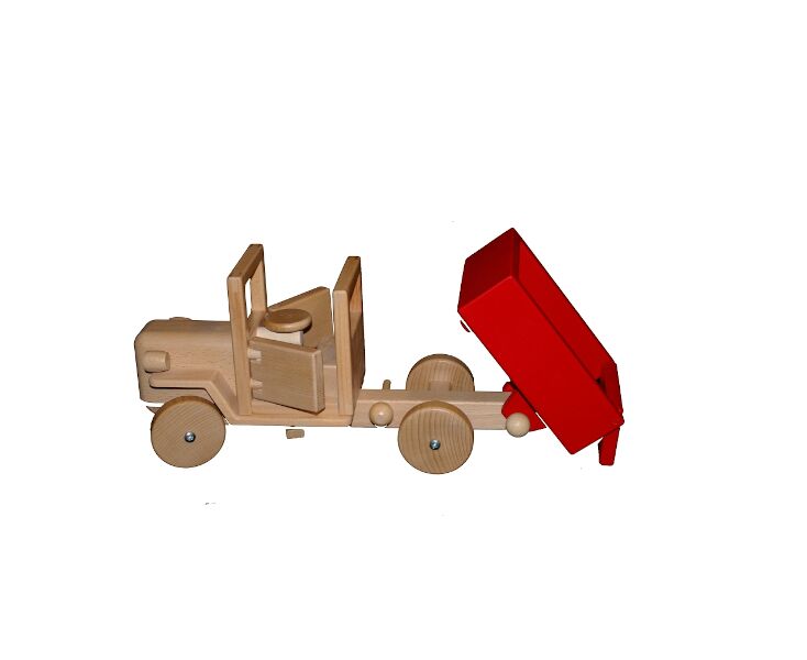 Stabiler, selbst hergestellter Holz-LKW aus Buchenholz; der Kipper hat eine bewegliche Heckklappe, so dass die Kinder wie auf der richtigen Baustelle arbeiten können.Die Aufsätze können gewechselt werden, so dass Sie jeden LKW mit unterschiedlichen Aufsätzen versehen können.